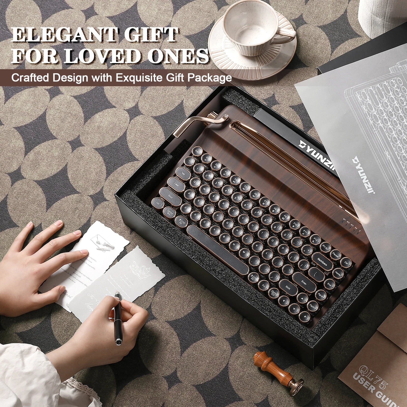 Retro Typewriter KeyboardYUNZII QL75 retro keyboard features a unique typewriter-style keyboard aesthetic with tri-mode connectivity ( BT/2.4gHz wireless/ wired) and a built-in stand for multiple devices. Each key row of this mechanical keyboard gradually ascends height for an ergonomic and comfortable typing experience. With the keyboard typewriter-style design, round keycaps, and pre-lubed switches, the wireless keyboard is perfect for lovers of retro keyboard and typewriter-style aesthetics.